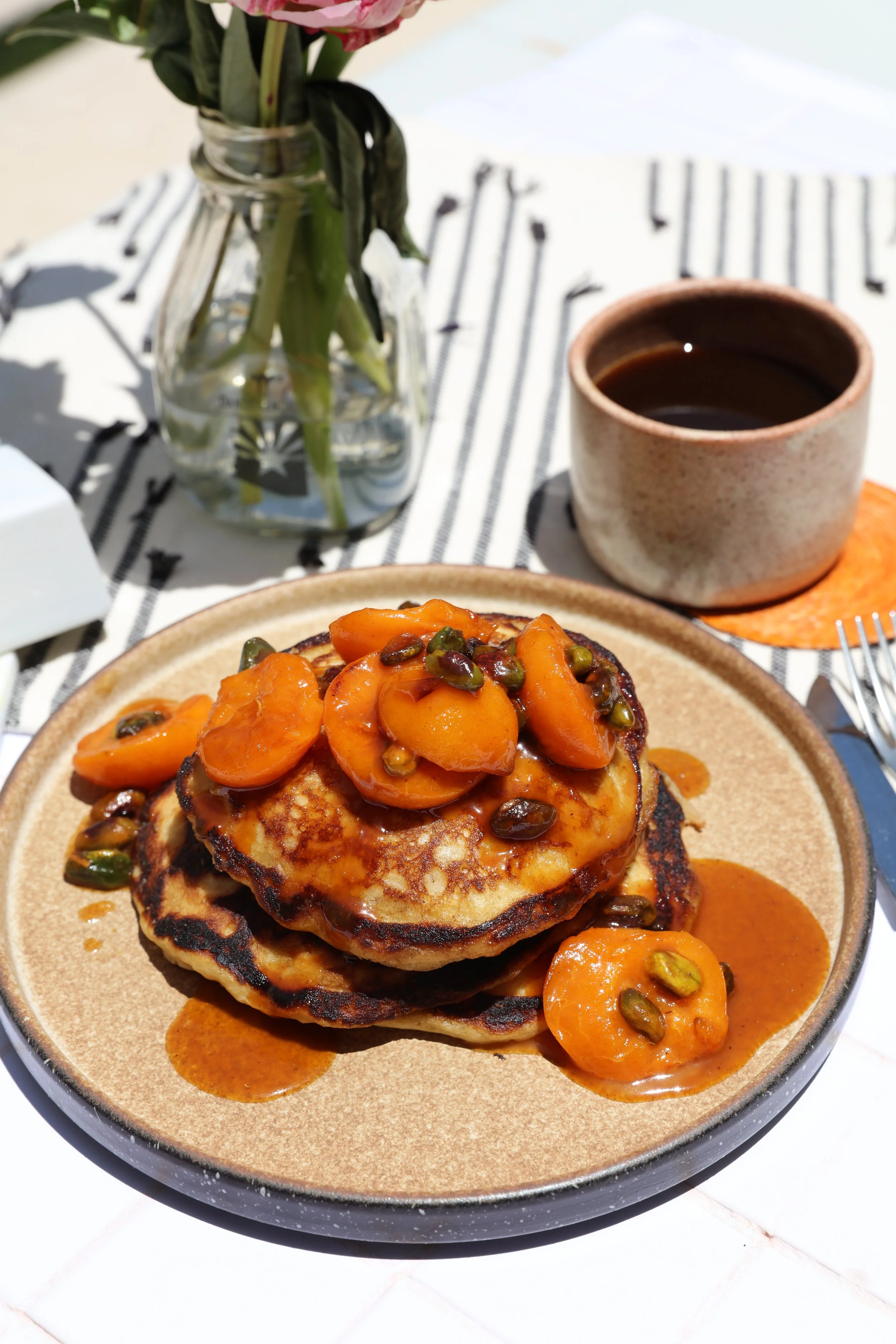 Oat Pancakes with Brown Butter and Pistachio Sautéed Apricots