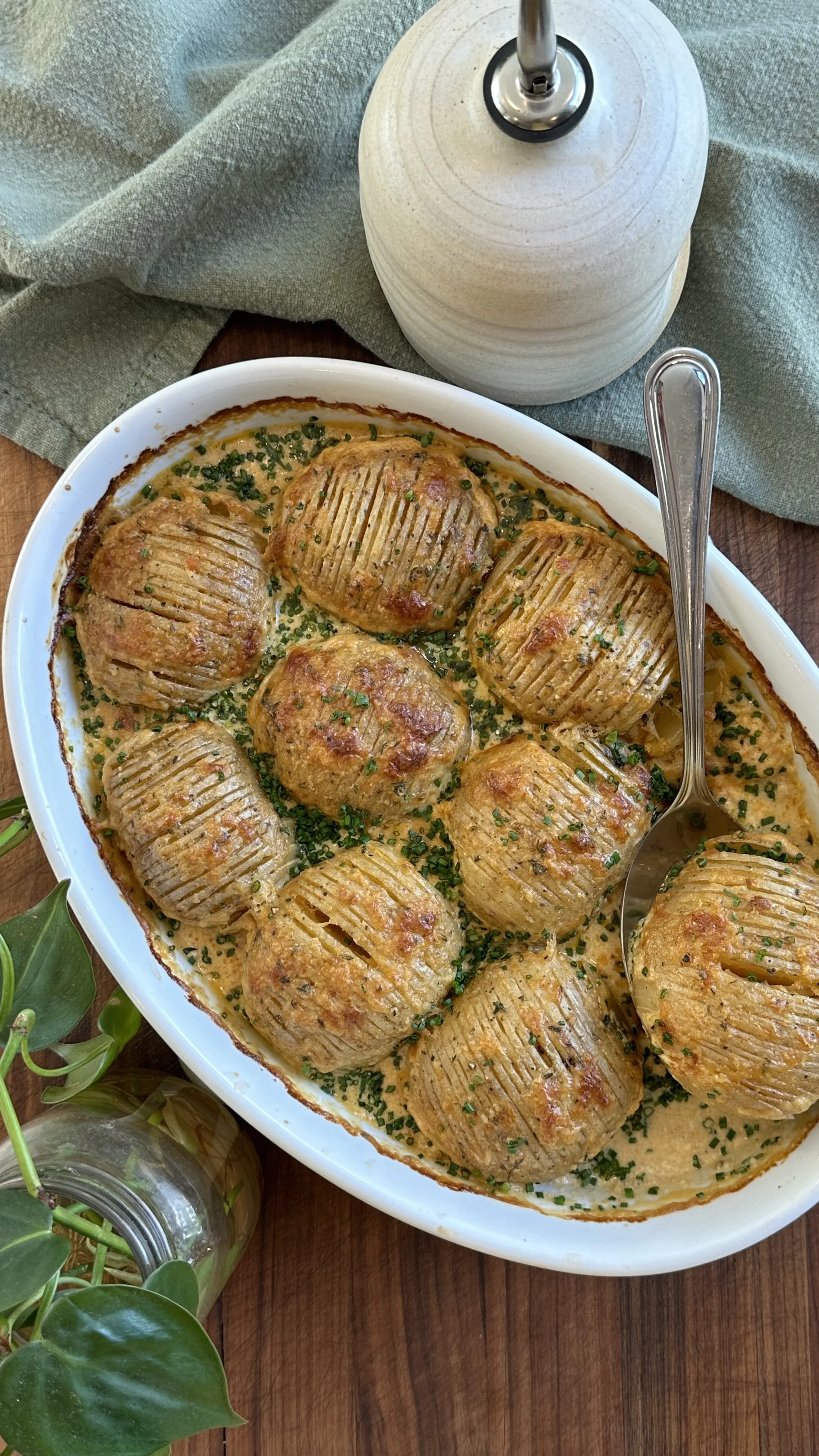 Use a spoon to douse each potato with the crema mixture, taking time to open up the slits and ensure each potato is well covered in the cream sauce.