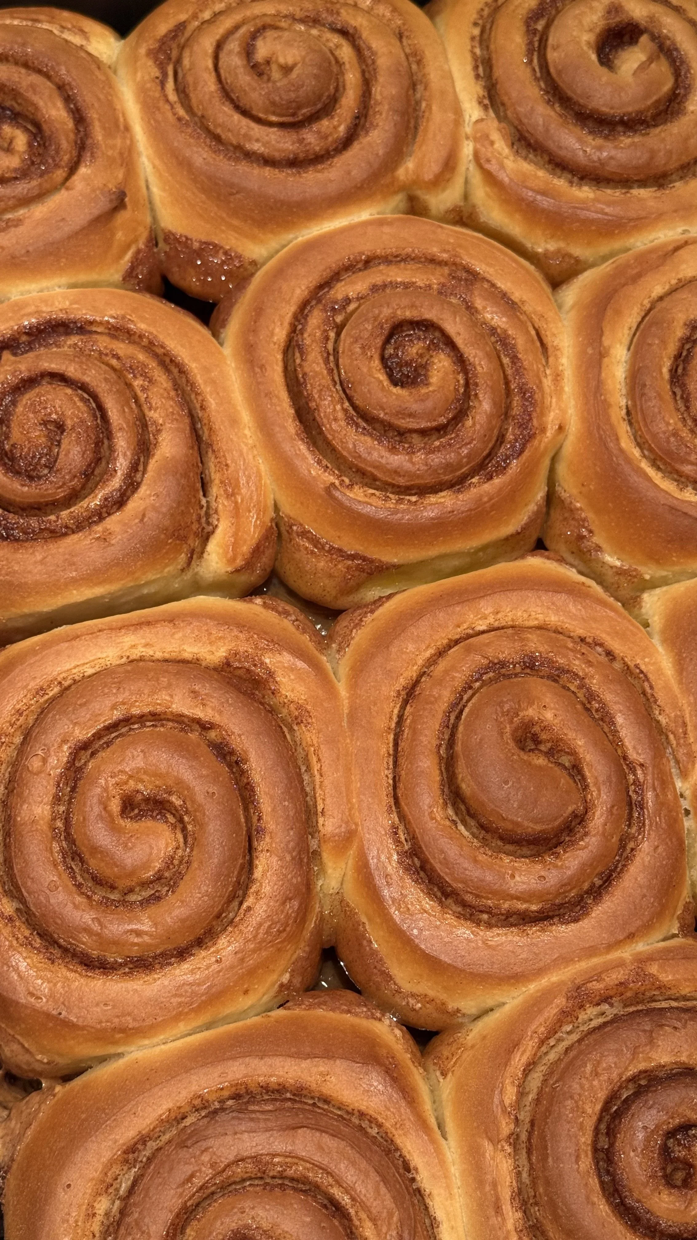 Cut the dough into even strips and roll each strip tightly, or roll the entire piece from the long side to form a log, then slice into 16 equal rolls. Place them cut-side up in the greased baking dish with the cream. Cover and let proof for about an hour, or until puffy and about one-third bigger in size.